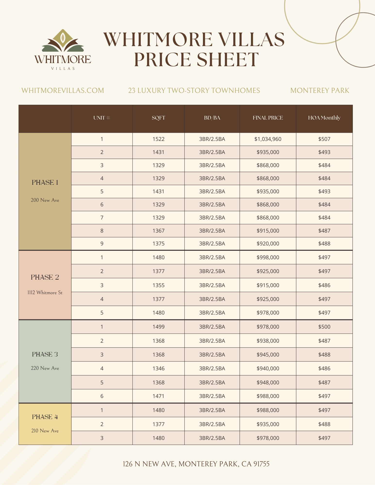 Whitmore Villas is an exclusive gated community of 23 luxury two-story townhomes and 40 apartments, thoughtfully crafted by the renowned Chateau Group and inspired by elegant Spanish Colonial Revival architecture. Each home features 3 bedrooms and 2.5 baths with open-concept floor plans ranging from 1,329 to 1,522 square feet, designed to enhance comfort, maximize space, and elevate everyday living.